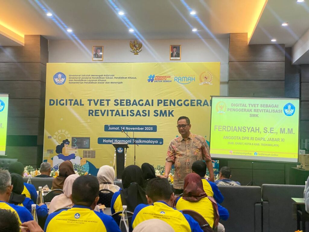 Berita Tasikmalaya, tasik.id – Anggota Komisi X DPR RI, H. Ferdiansyah, SE, MM mendorong percepatan revitalisasi Sekolah Menengah Kejuruan (SMK) melalui penguatan program Digital TVET. Hal tersebut disampaikannya saat membuka kegiatan Digital TVET di Hotel Harmoni Kota Tasikmalaya, Jumat (14/11/2025).
