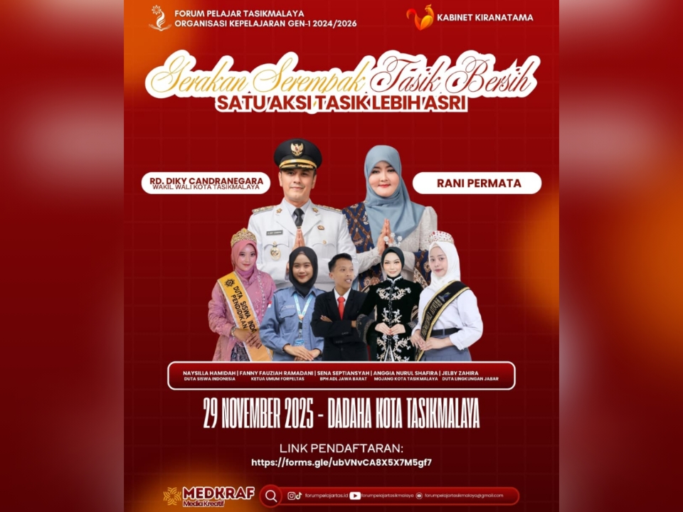 Berita Tasikmalaya, tasik.id – Ratusan pelajar di Kota Tasikmalaya, khususnya Ketua dan Wakil Ketua Osis Kota Tasikmalaya akan turun melakukan aksi bersih-bersih sampah di kawasan Dadaha pada Sabtu (29/11/2025). Kegiatan ini merupakan bagian dari program Gerakan Serempak Tasik Bersih (Gersik) yang diinisiasi oleh Forum Pelajar Kota Tasikmalaya. Serta melibatkan berbagai organisasi daerah, pelajar lintas sekolah, dan masyarakat umum.
