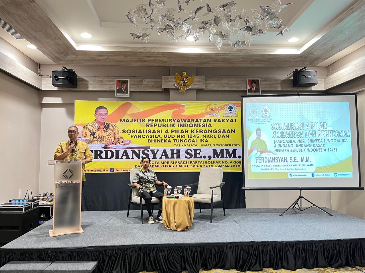 Pemaparan materi disampaikan langsung oleh Anggota MPR RI Ferdiansyah, SE., MM., menjelaskan pentingnya Pancasila sebagai dasar negara dalam Sosialisasi Empat Pilar bersama masyarakat Tasikmalaya.
