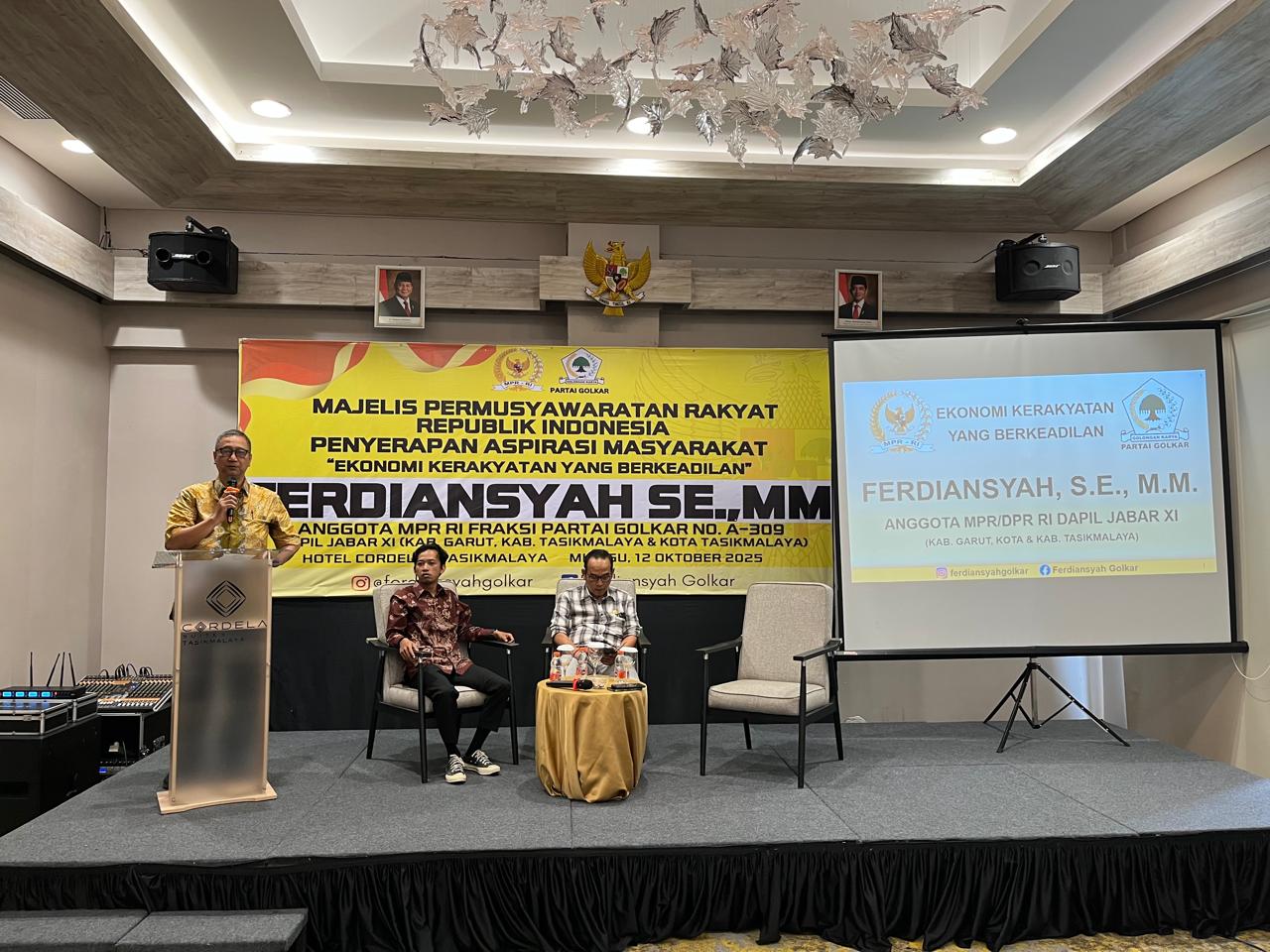Berita Tasikmalaya,tasik.id – Dalam upaya pemerataan pembangunan untuk mewujudkan ekonomi kerakyatan yang berkeadilan, Ferdiansyah selaku Sekretaris Fraksi Partai Golongan Karya (Golkar) MPR RI melakukan kegiatan penyerapan aspirasi masyarakat di Daerah Pemilihan (Dapil) Jawa Barat XI (yang Meliputi Kabupaten Garut, Kabupaten serta Kota Tasikmalaya).